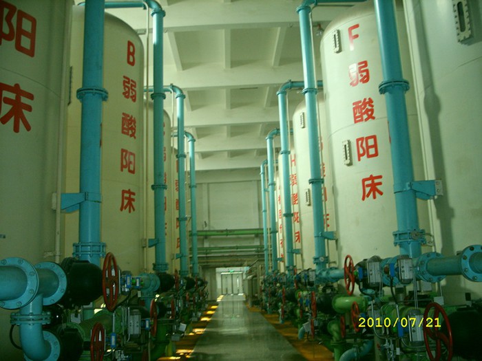 鋼襯膠混床,正常工作時(shí),陰陽(yáng)離子樹脂按一定比例合在一起進(jìn)一步去除水中溶解性離子,設(shè)計(jì)不同組合其出水電導(dǎo)可達(dá)到1~18M-cm 。均勻混合的樹脂層中,陽(yáng)樹脂與陰樹脂緊密地交錯(cuò)排列,每一對(duì)陽(yáng)樹脂與陰樹脂顆粒似于一組復(fù)床,混床就象無(wú)數(shù)組串聯(lián)運(yùn)行的復(fù)床。通過混合離子交換后進(jìn)入水中的氫離子與氫氧離子會(huì)立即生成電離度很低的水分子(H2O),很少可能形成陽(yáng)離子或陰離子交換時(shí)的反離子,因而能制取純度相當(dāng)高的成品水。