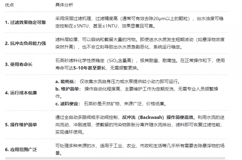 總之,石英砂過濾器是一種效高、經濟、耐用且維護簡單的物理過濾設備。其核心價值在于效率高去除懸浮物和顆粒物,顯著降低水的濁度。雖然功能相對單一,但作為水處理工藝中的“中流砥柱”和“前置衛士”,它為基礎水質保障和后續精*處理的穩定運行提供了不可或缺的作用。其好的性價比和可靠性使其成為全球應用廣泛的水過濾技術之一。